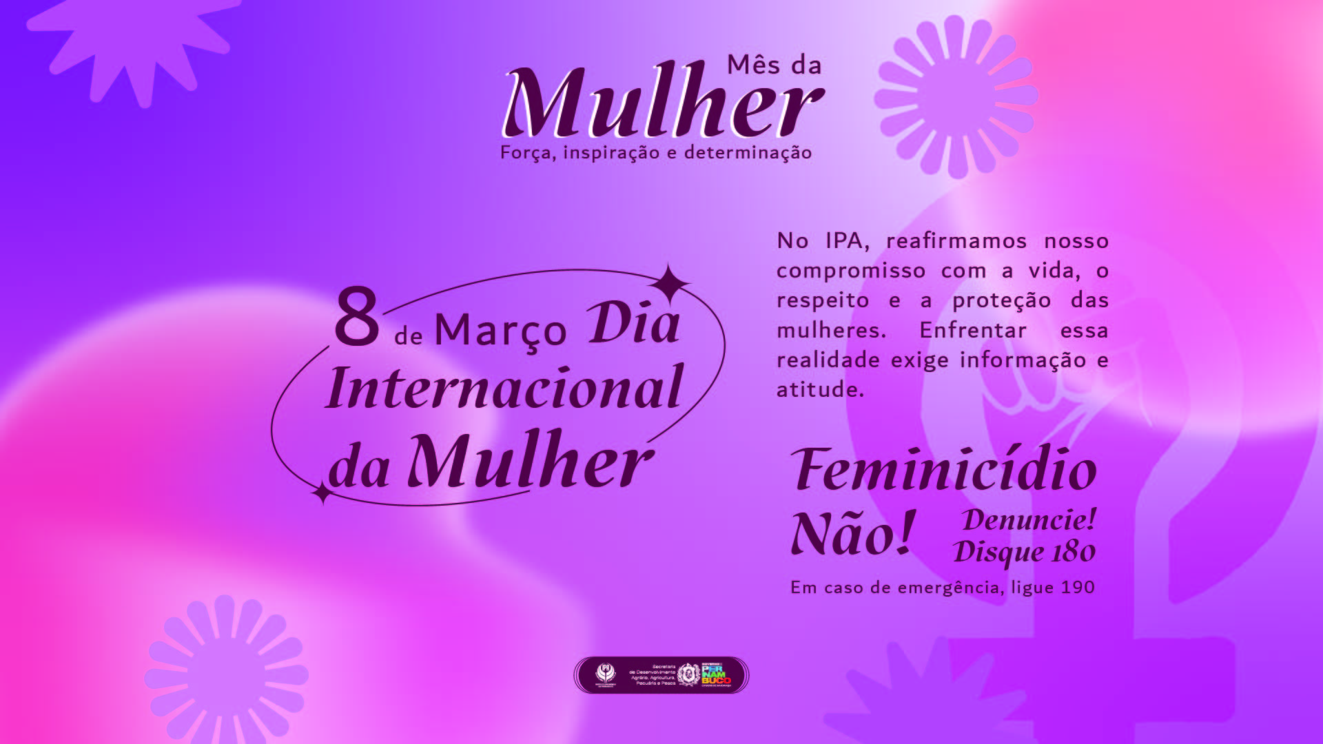 “Março é um mês que nos convida à reflexão e à ação. Celebrar o Dia Internacional da Mulher é reconhecer a força, a competência e o papel transformador das mulheres na sociedade e, especialmente, no desenvolvimento do nosso estado. No IPA, convivemos diariamente com mulheres que são protagonistas no campo, na pesquisa, na assistência técnica e na gestão pública. Mas este também é um mês de posicionamento firme contra a violência de gênero. Sob a liderança da governadora Raquel Lyra, o Governo de Pernambuco tem fortalecido políticas públicas voltadas à proteção e à valorização das mulheres, e o IPA está alinhado a essa missão”, destacou.